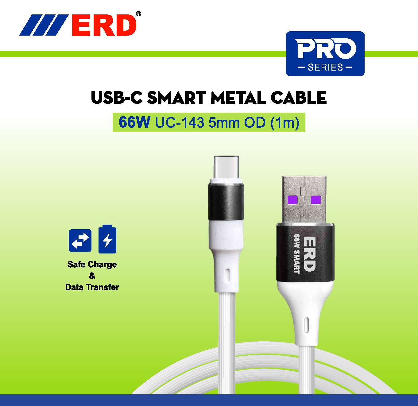 The ERD PRO Series UC-143 USB-C Smart Metal Braided Data Cable is designed for intelligent fast charging, superior durability, and reliable data transfer. Equipped with a smart charging chip, a reinforced metal connector head, and a thick 5mm outer diameter (OD) braided cable, it delivers up to 66W fast charging while protecting your device from over-current and overheating. Ideal for users who demand performance with safety.