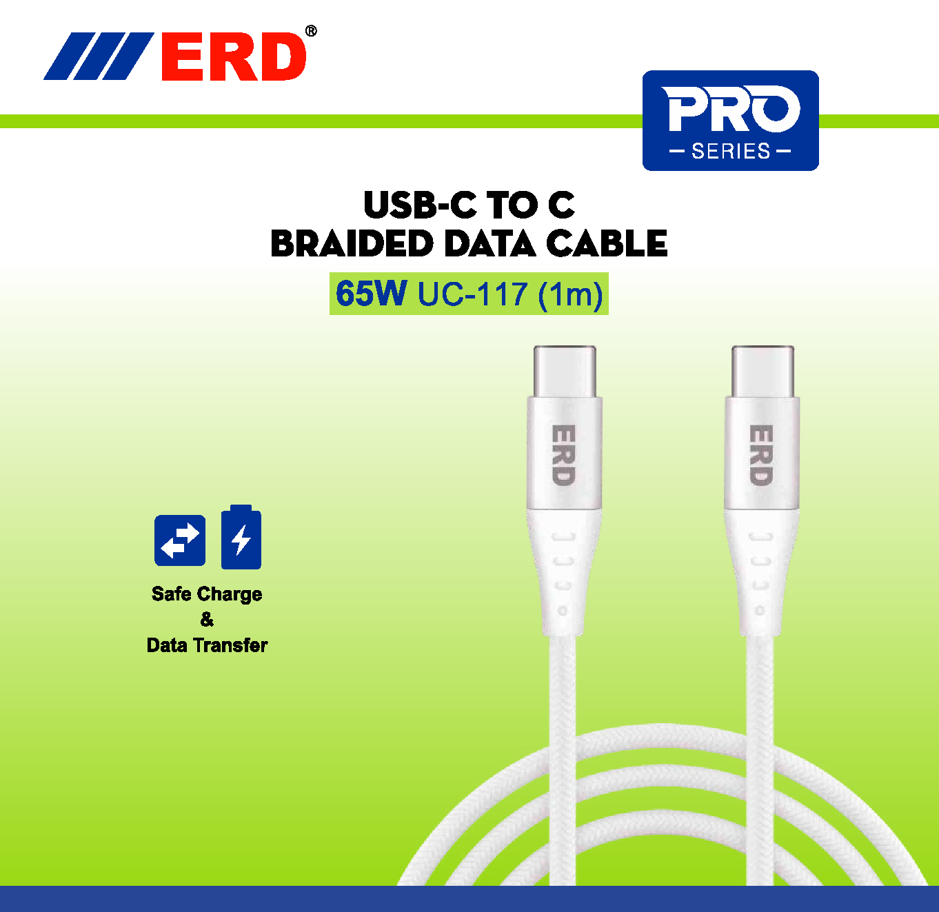 The ERD PRO Series UC-117 USB-C to USB-C Braided Data Cable is engineered for high-power fast charging, stable data transfer, and long-term durability. With support for up to 65W fast charging, it is perfectly suited for smartphones, tablets, power banks, and USB-C laptops. The reinforced braided exterior ensures strength, flexibility, and resistance to daily wear.